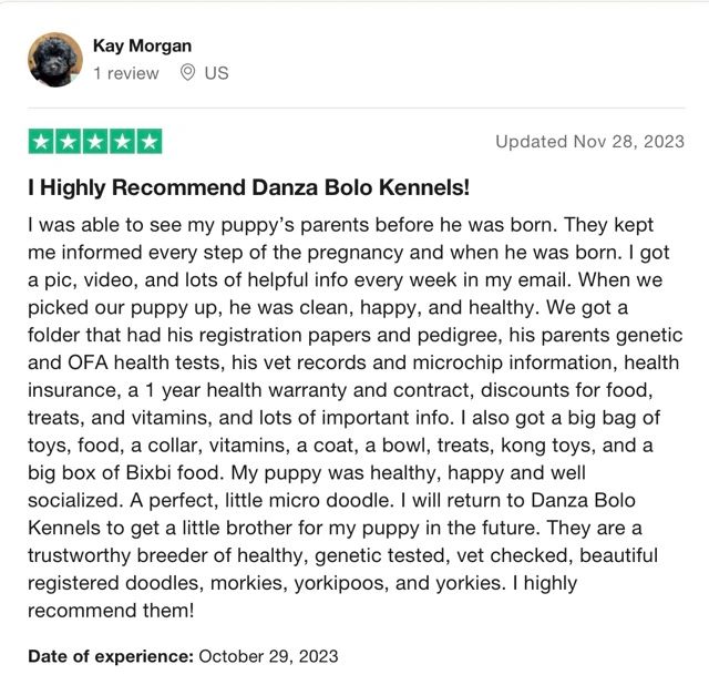 12/2/21 .... I just want to tell you how happy I am with this little girl. She is so loving, so playful, and so very smart. We go for long walks together (less than 2 miles) and when we get back she still doesn't want to go into the house. We always meet people and their dogs along the way, and so many of them tell me how amazed they are at how confident Moxie is in herself. She is not afraid of the people or their dogs--large or small. She's just happy to meet them all. And to play with any dog along the way. I thank you so much for all you did in raising such a positive, healthy little girl. She now wants me to hold her chewy bones while she chews on them--which, of course, I do happily! Thank you. Have a wonderful holiday season. You have blessed mine.