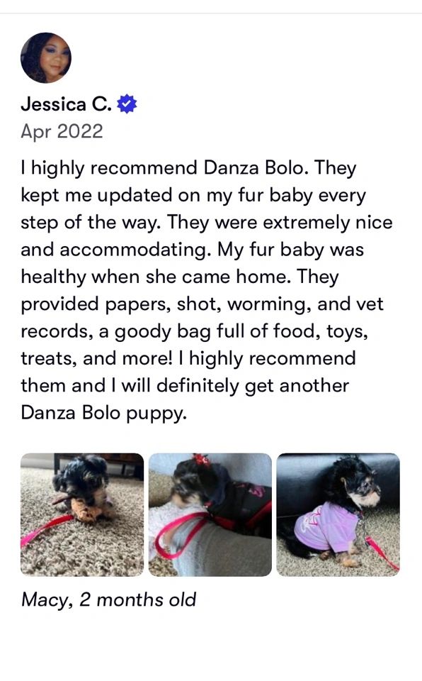 10/6/21 .... And thank you again for a happy, healthy, loving little girl whom I love more and more every day if that is at all possible because I love her to death as it is!! She is so content, happy, secure--not at all afraid or nervous and that is what your excellent breeding and upbringing did. She is also a little energy machine. We play and play most of the day until she crashes for her well-deserved naps. My sister sent her 2 cartons of toys, many of which she and her little needle teeth have destroyed, but some remain. Many of my friends have come to meet her and she welcomes every one of them--and they love her!! Thank you more than words can say for this little blessing.
